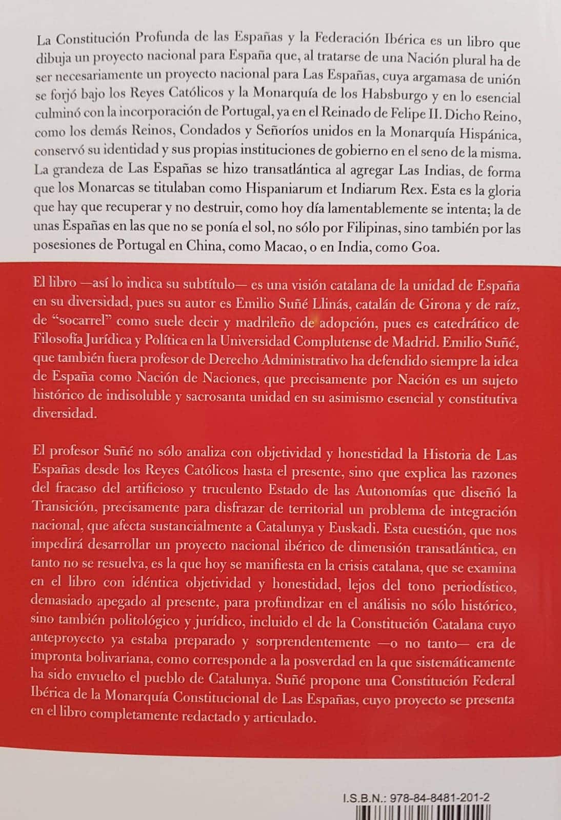 La Constitución Profunda de las Españas y la Federación Ibérica es un libro que dibuja un proyecto nacional para España que, al tratarse de una Nación plural ha de ser necesariamente un proyecto nacional para Las Españas, cuya argamasa de unión se forjó bajo los Reyes Católicos y la monarquía de los Habsburgo y en lo esencial culminó con la incorporación de Portugal, ya en el reinado de Felipe II. Dicho Reino, como los demás Reinos, Condados y Señoríos unidos a la Monarquía Hispánica, conservó su identidad y sus propias instituciones de gobierno en el seno de la misma. La grandeza de Las Españas se hizo transatlántica al agregar Las Indias, de forma que los monarcas se titulaban Hispaniarum Rex. Esta es la gloria que hay que recuperar y no destruir, como hoy día lamentablemente se intenta; la de unas Españas en las que no se ponía el sol, no sólo por Filipinas, sino también por las posesiones de Portugal en China, como Macao, o en India, como Goa. El libro -así lo indica su subtítulo- es una visión catalana de la unidad de España en su diversidad, pues su autor es Emilio Suñé Llinás, catalán de Girona y de raíz de «socarrel» como suele decir y madrileño de adopción, pues es catedrático de Filosofía Jurídica y Política en la Universidad Complutense de Madrid.